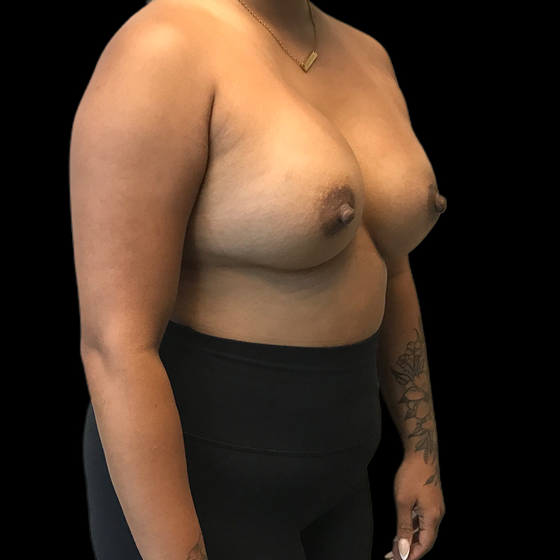 This patient underwent a unilateral breast augmentation revision to correct implant positioning. Her right implant had not dropped properly and was sitting higher on the chest, while the left side had settled as expected. Through a periareolar approach, the right implant was removed and replaced with a 560cc Smooth Round High Profile Xtra implant, achieving better symmetry and a more natural contour.